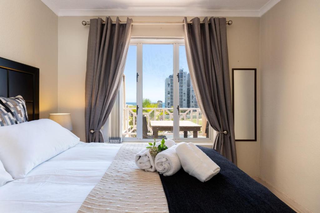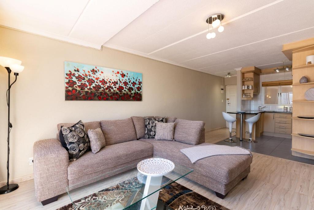 This modern 2 bedroom self-catering apartment on second floor is within walking distance of Blouberg beach. It has a Fully equipped open plan kitchen leading onto lounge area. The kitchen is fitted with fridge, flat top stove, microwave, kettle & toaster, Washing machine, crockery, cutlery & cooking utensils. Sliding doors that lead out onto a spacious balcony overlooking the estate and pool, with ocean and mountain views. Refurbished and modern kitchen and bathroom. Laminated wooden floors throughout. The Main bedroom has large windows looking onto balcony with good light and a ceiling fan. The second bedroom has a single bed and ceiling fan. The Lounge has large flat screen TV with DSTV capabilities, unlimited high-speed wifi, air conditioner and modern finishes. Complex has swimming pool, tennis court, squash court and laundry facilities with 24 hr gate access. Shade net covered parking. Restaurants shopping malls & golf course nearby. Please contact our Reservations Department for availability and rates.