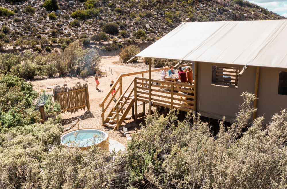 AfriCamps at Karoo 1, Hex Valley, boasts 13 boutique glamping tents overlooking the picturesque farm and its surrounding rock faces. The tents dot the landscape and lead the way to a stunning natural rock pool – an oasis against the arid Karoo backdrop.