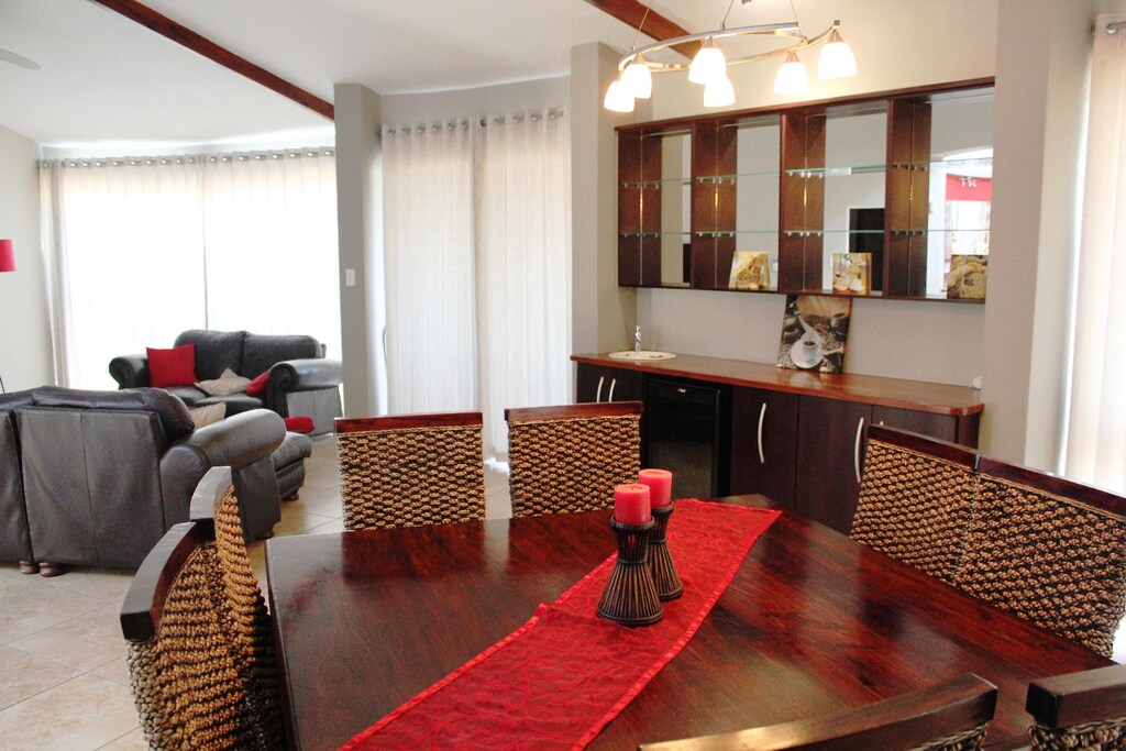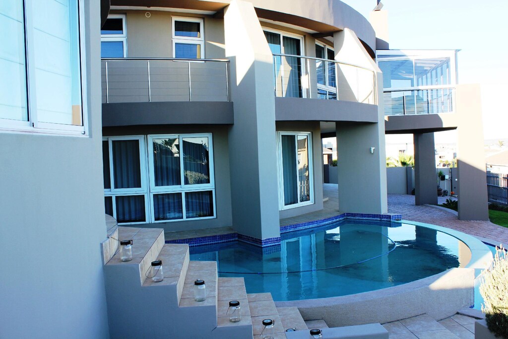 This, spectacular, modern home invites you to enjoy every moment of luxury and freedom during your stay in Langebaan, The Glass covered area boasts a braai with stackdoors to open during the day and glass roof to view the spectacular open sky at night. Indulge yourself in pizza making your own in the pizza oven, maybe cooking on an old wooden stove and getting all snuggling in winter. Relax in the sparking blue pool, or enjoy the spectacular surroundings with the yacht club and golf course around the corner. There are ample space for parking and even for your boat! Please contact our reservations department for availability and rates.