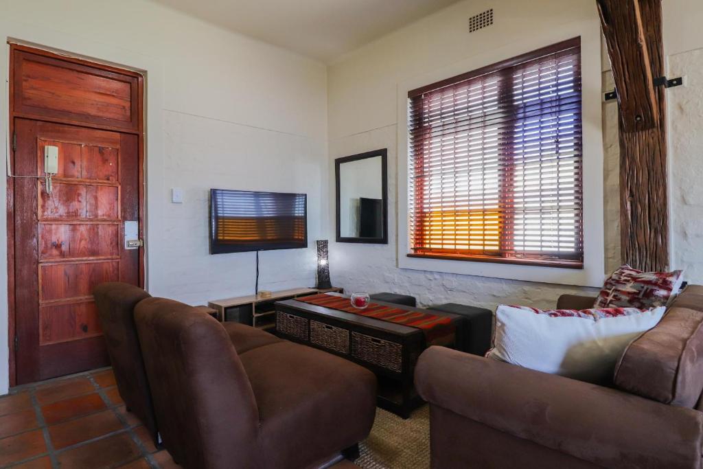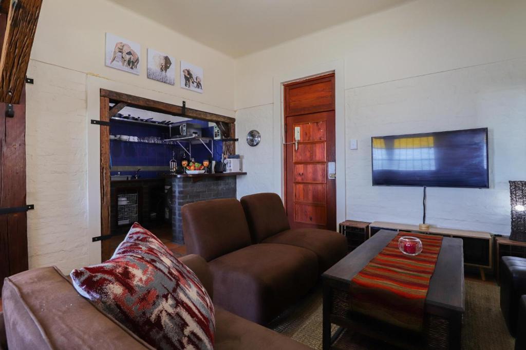 The apartment features a cosy living room area, with a warm red and brown theme, which has a sleeper couch, two single couches as well as a smart TV with access to Netflix/Youtube and other streaming platforms which gives the viewer a variety of options for a movie night with a bowl of popcorn and snacks. To your right you will find the the quaint and unique kitchenette with dark blue tiling, which is fully equipped with all modern necessities including a stove, fridge, Nespresso coffee machine, washing machine and not forgetting the utensils, crockery and cutlery for nights when you feel like cooking a delicious home-made dish.
