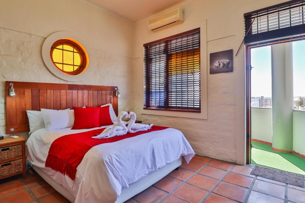 Moving onto the bedroom, which follows the the same brown and red theme. Here you will find a spacious queen size bed with a wooden headboard, complemented by bedside tables on both sides and above the headboard you will see a old fashioned, circular-orange-tinted, glass window. The room also comes with air-conditioning. The en-suite bathroom with a toilet and shower has good space with a nice blue themed decor. Your bedroom then leads to the furnished balcony with views of Sea Point and a partial glimpse of the sea. Enjoy a conversation and a meal on the balcony while looking at the lights of Sea Point while admiring the night sky. It is the perfect space to wind down and to absorb the sights of the area.