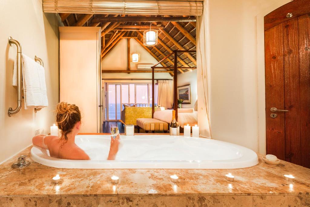 All bedrooms are air-conditioned and offer luxury and style. Each bedroom opens onto a private deck with stunning views of the beach and infinity pool below. The luxury upstairs room offers an extra outdoor shower and Jacuzzi in its deck, from where spectacular sunsets can be enjoyed.